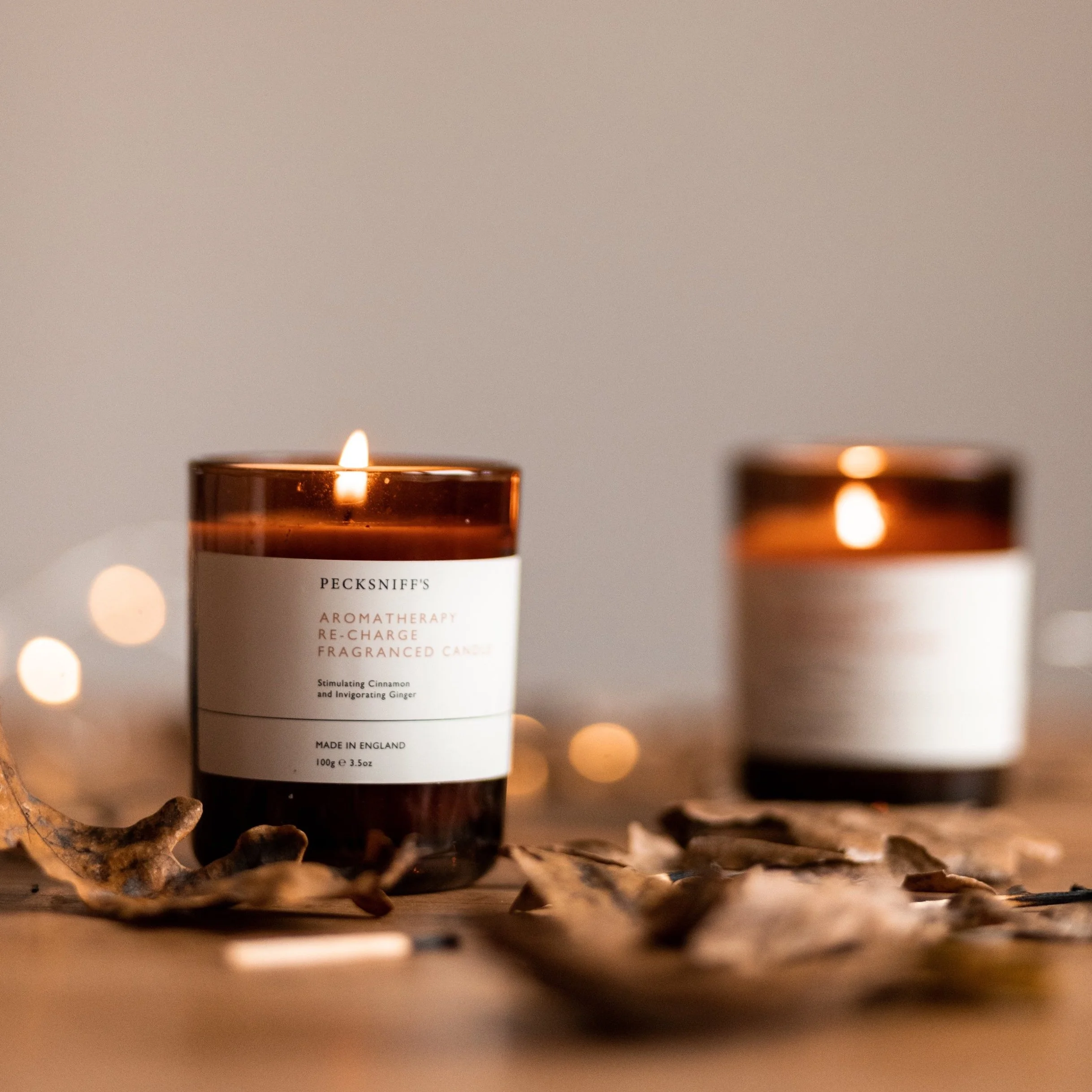 Fall candles on a bed of dried leaves